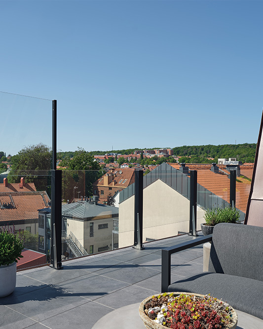 Stilrene glasgelændere i standardhøjde, der rammer uderummet ind