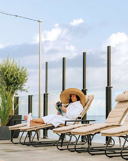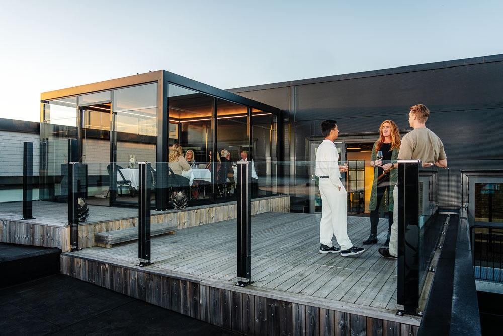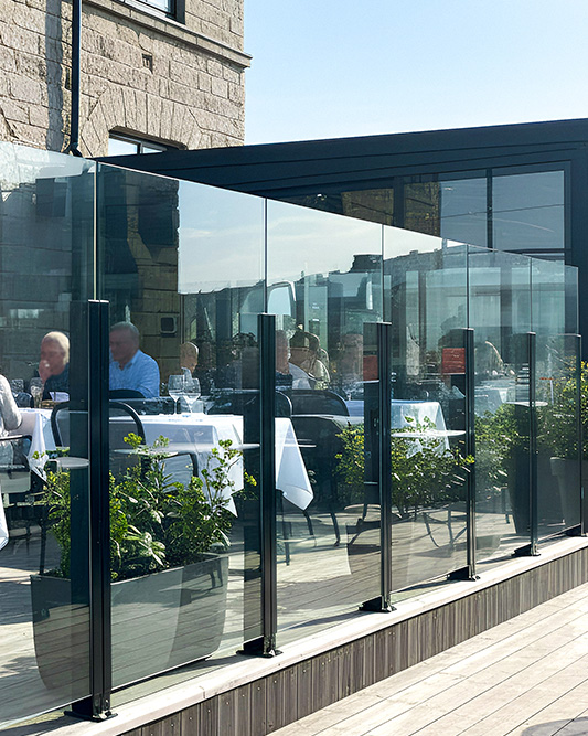 Glasgelændere med frie glaskanter og vindskærm, der nemt kan hæves og sænkes