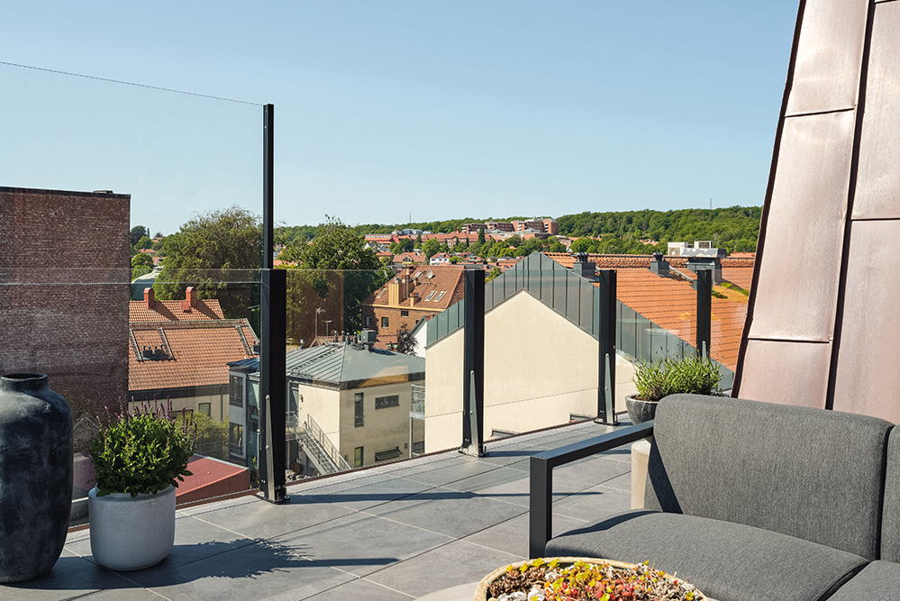 Glasgelænder med højdejusterbar vindafskærmning, udviklet til sikre altaninstallationer, hvor der forekommer faldrisiko. Opfylder kravene til sikker altaninstallation.